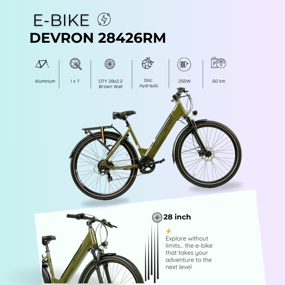 Bicicleta Electrica Devron 28426RM - 28 Inch este alegerea ideala pentru cei care doresc o solutie moderna, fiabila si confortabila pentru deplasarile in oras. Fie ca mergi la serviciu sau la o plimbare relaxanta, aceasta bicicleta iti ofera libertatea si placerea de a pedala fara efort.